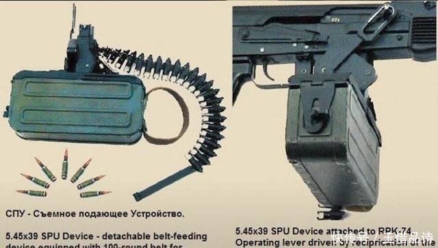 尽管如此,伊热夫斯克工厂对PU-1的自供弹弹链箱仍不死心,对其设计改进,优化脱链和供弹机构,使其可直接安装在RPK-74上,无需对枪进行任何改装,并缩小弹箱容量至100发。这个弹链箱被称为SPU(俄文СПУ-СъемноеПодающеУстройство,意为“可拆卸供弹装置”),其拥有完全外露的拉机柄连杆,直接套在拉机柄上使用。