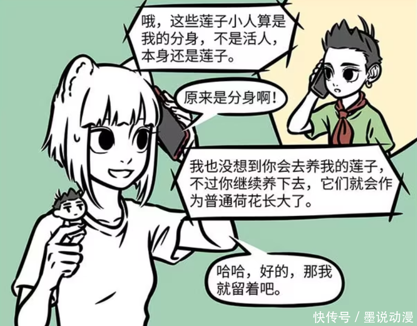 因为出现了这个问题,所以九月要请教哪吒。这些莲子小人到底是什么?哪吒告诉九月,这是他的分身,算不得活人,本身还是莲子。九月知道是哪吒分身之后,也就放心了不少。哪吒是没想到,九月竟然会去养他的莲子。不过只要继续养下去,以后就会作为普通莲花长大下去。九月听到之后,也就知道该怎么做。