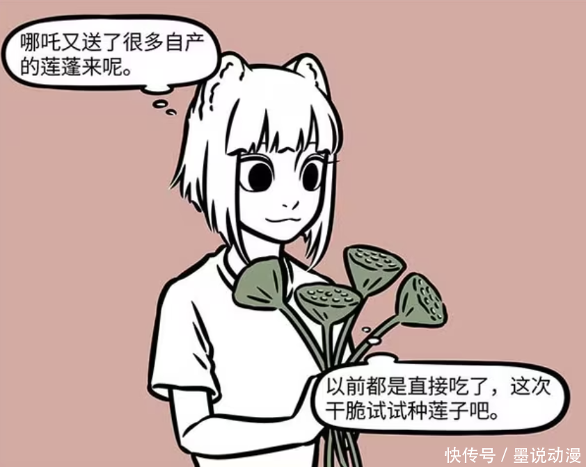 《非人哉》漫画版中,哪吒送给九月很多莲蓬。九月并没有拿去直接吃,而是将这些莲子种起来。谁能想到,这些莲子长出了许多小哪吒。哪吒告诉九月,只要继续养下去,就会变成跟普通荷花。谁能想到,九月并没有继续养,而是做成莲子羹。